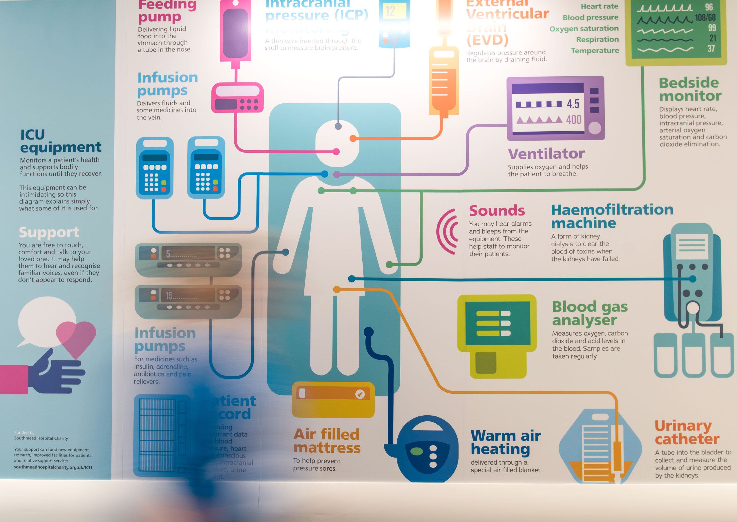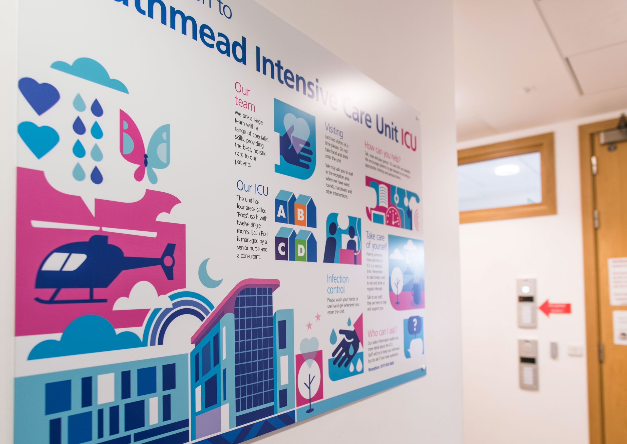 We developed an integrated set of graphics and infographics for Southmead Hospital ICU. From large-format wall art to leaflets, our designs orientate, inform and engage both staff and visitors – brightening up corridors and improving wayfinding.